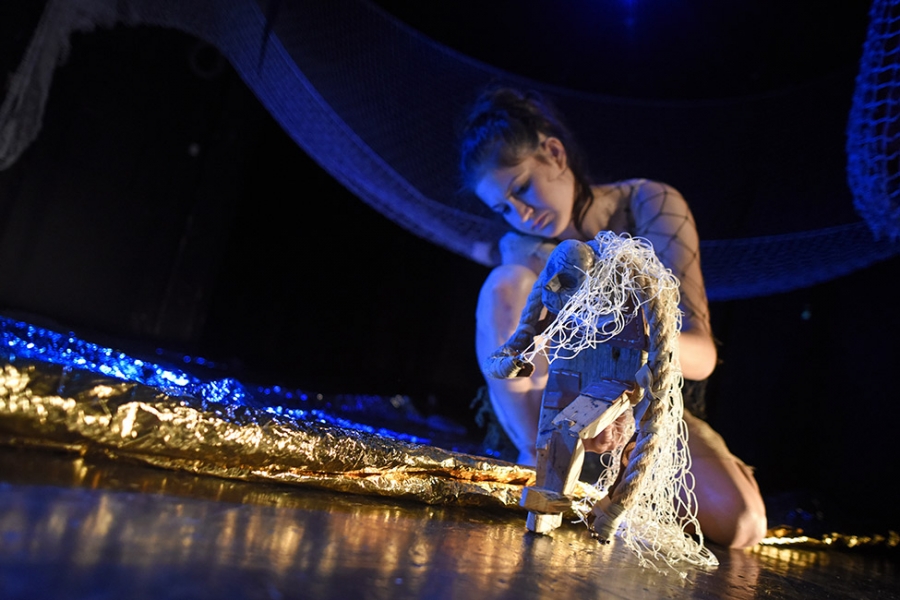 Známý příběh očima mladé ženy, která se na západním pobřeží Čech vydává na svou nejdobrodružnější plavbu. Obrazivé monodrama o síle a moudrosti stáří, o nevinnosti a naivitě mládí a především o kráse a krutosti přírody. Vznik loutky starce má svůj příběh: dřevo na jeho tělo našla herečka vyplavené na břehu moře v Norsku. A součástí mechanismu loutky je bojový pás, s jehož pomocí loví rybáři na moři.